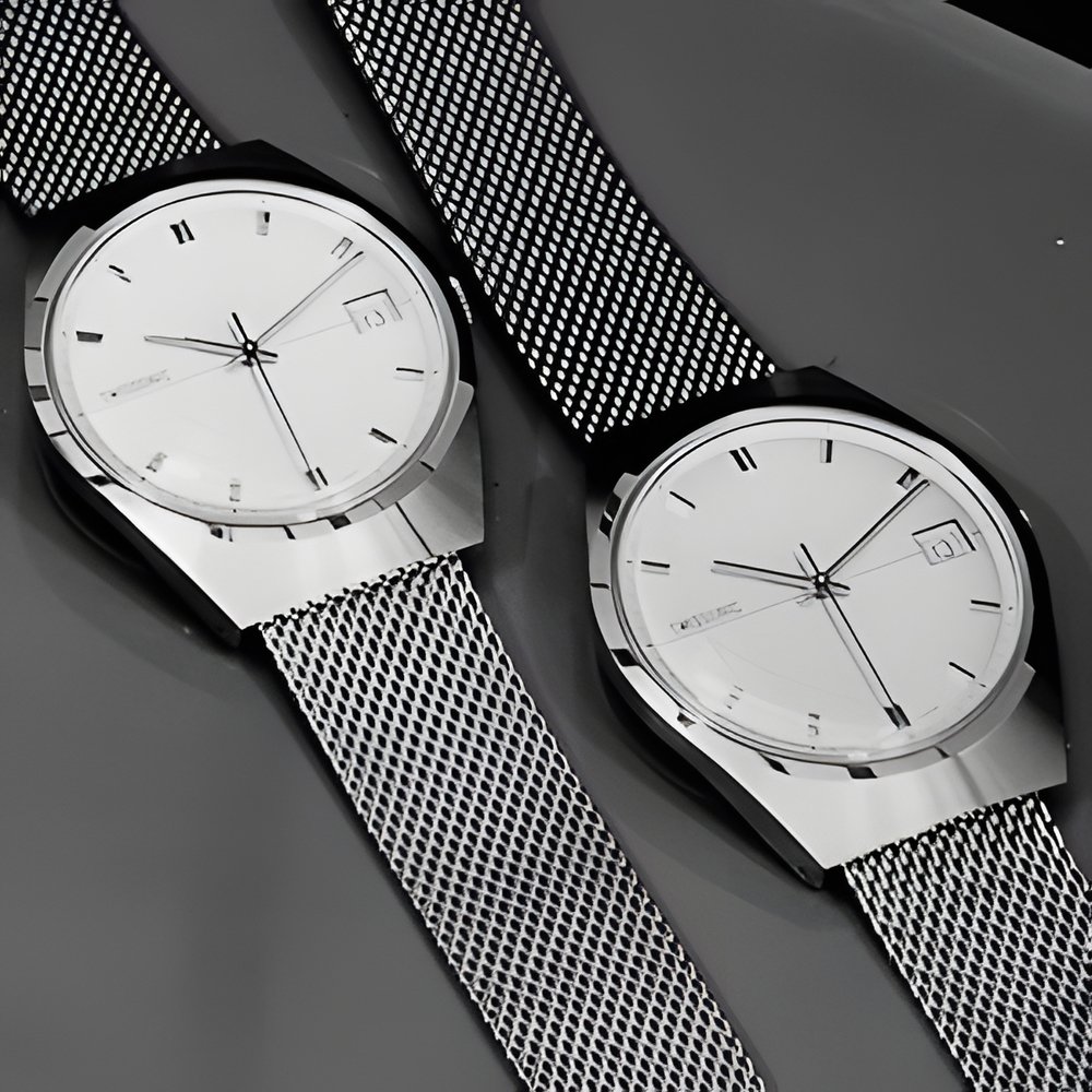 Detailed view of the “Swissonic” electronic watches presented in Basle by the Horological Electronic Center (CEH) in the “Future Watchmaking” section, an exhibition dedicated to horological scientific research that will henceforth be held each year as part of the Swiss Watch Fair. These watches, equipped with a calendar, have an 18-carat (left) or a stainless steel case (right) of surprising thinness.