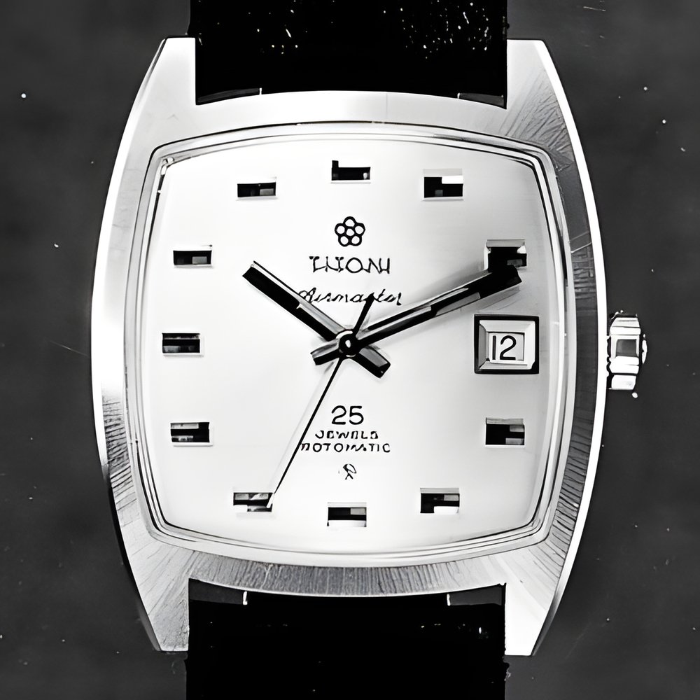 Soft, modern lines, perfect integration of bracelet and case, and subdued dial face distinguish this new Titoni model. Stainless steel, water-resistant case, self-winding movement and calendar. (FELCA-TITONI “Airmaster”)