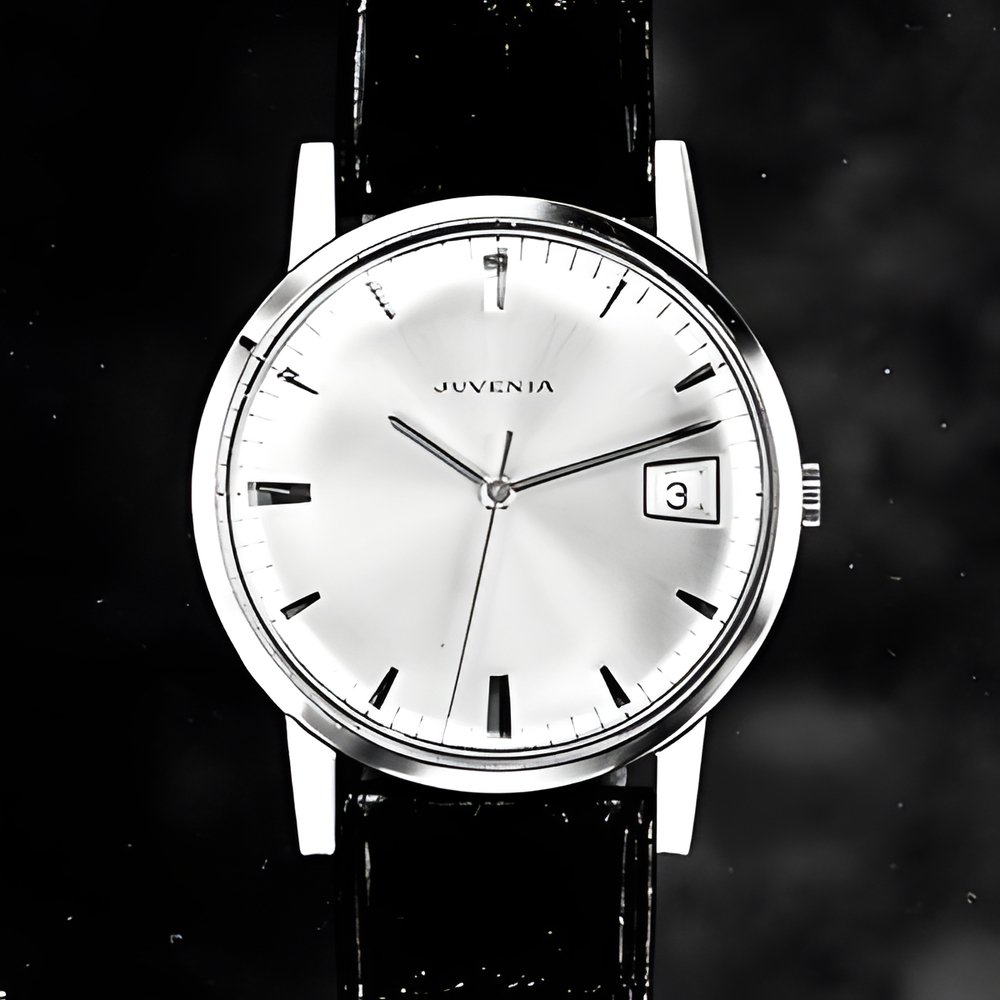 The high-frequency (36,000 vibrations per hour) automatic watch was one of the most notable highlights of the 1967 Watch Fair. No less than eleven manufacturers unveiled watches of this type with a balance-wheel oscillation nearly twice that of standard watches. This system ensures a very high rate stability. This Juvenia model has a stainless steel waterresistant case and a calendar. (JUVENIA)