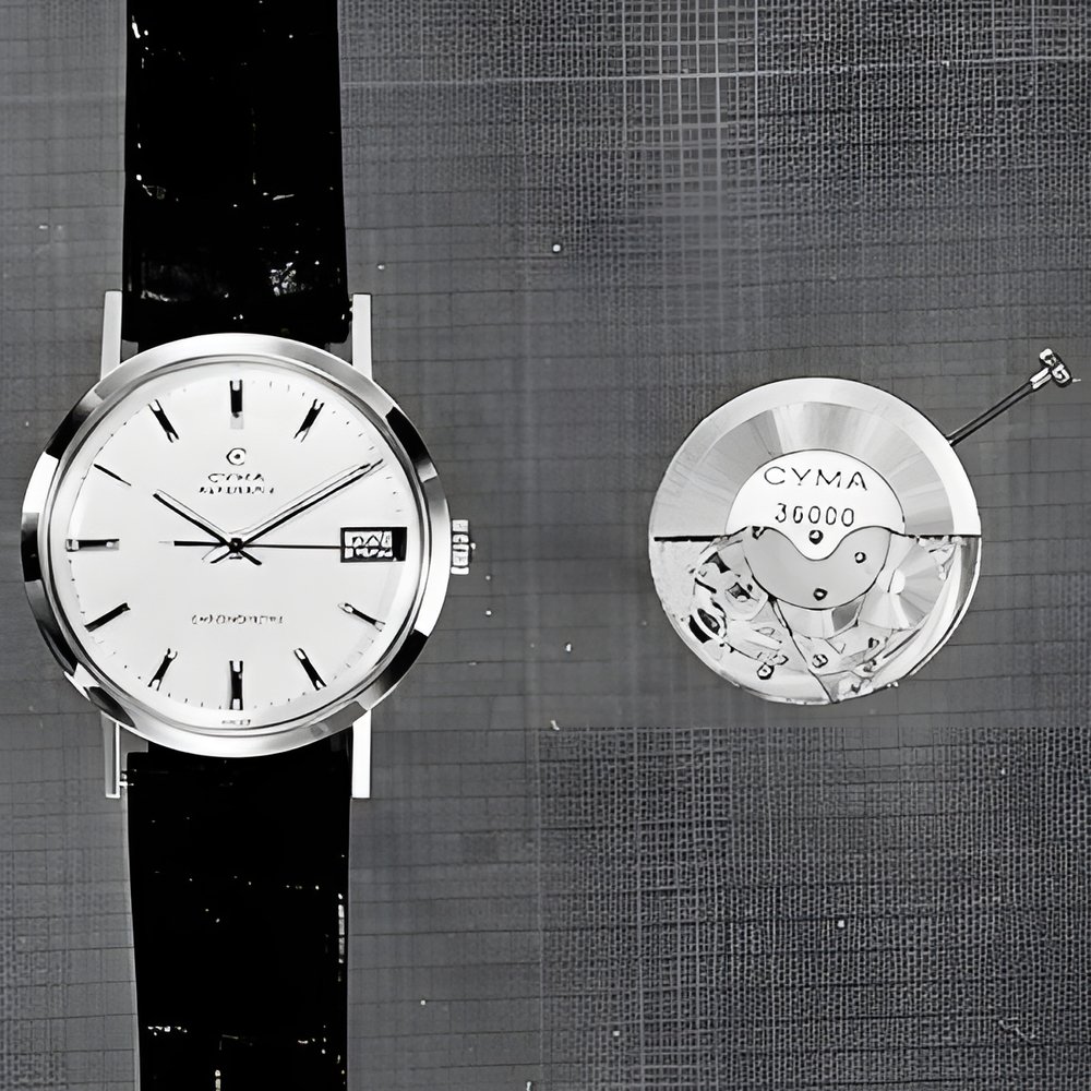 The presentation of numerous watches equipped with a highfrequency (36,000 vibrations per hour) automatic movement caused a certain surprise at the 1967 Watch Fair. This new system allows a very high rate stability and nearly all the watches on display were officially certified chronometers. Here is one such model, along with its movement. Gold-platbd case, calendar. (CYMA)