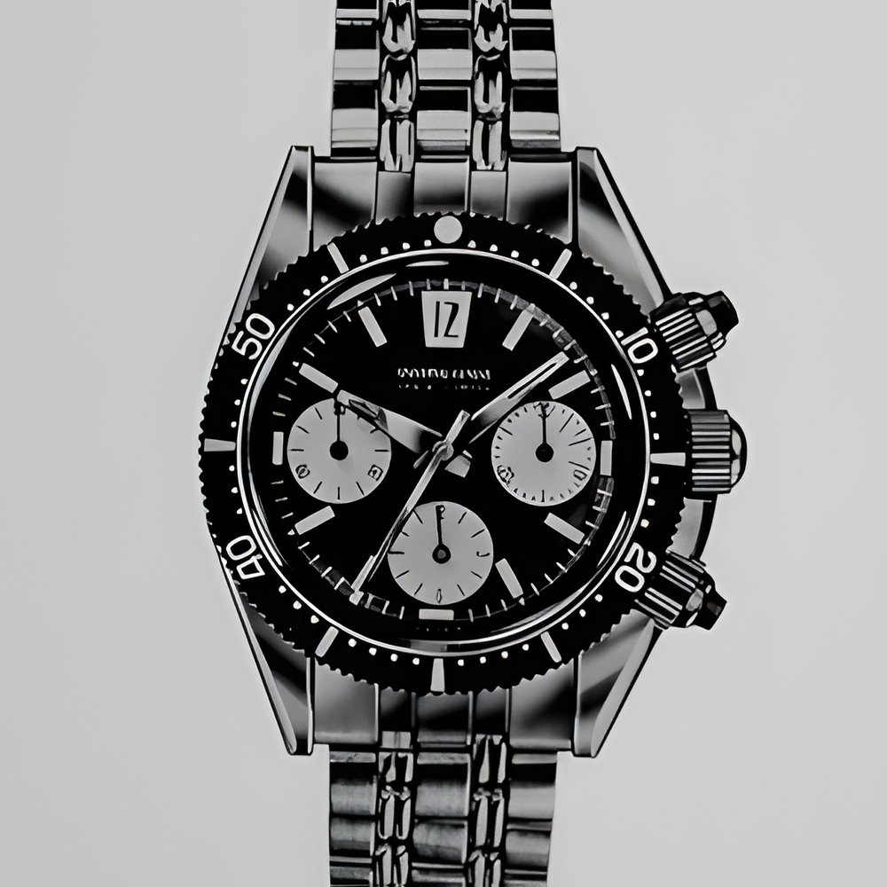 This diving chronograph boasts a novel technique of giving the push-pieces the fullest possible water-resistance. They are specially protected by a screw-capsule topped by a cap, replaceable in case of tear. It also has a screwed-in crown and turning bezel, a minute circle graduated to the 1/5th of a second, minutes and hours totalizers. Guaranteed waterresistant to 25 atmospheres (820 feet or 250 meters) (UNIVERSAL ’Space Compax")