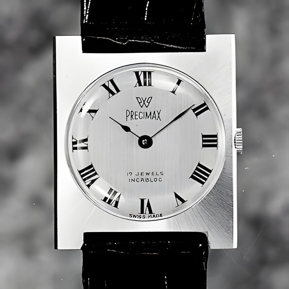 This extra-slim man’s watch, with clean sober lines, has an 18-carat gold case. An example of present-day styling is the smooth integration of bracelet and practically hornless case. Gilded dial, 12 Roman numerals. (PRECIMAX)