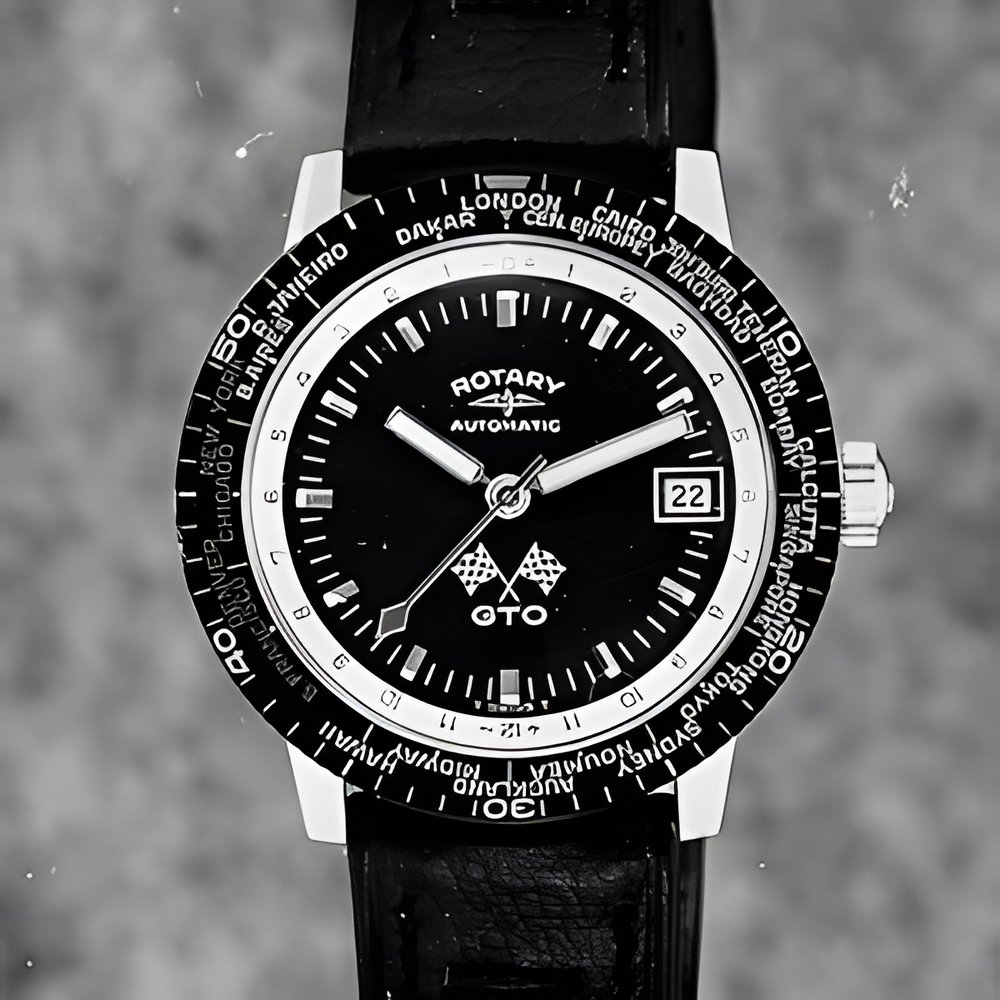 A typical example of the “technical” type of watch whose popularity is definitely on the increase. This Rotary “GTO” model has all the characteristics of a diving watch and is water-resistant to 660 feet (or 200 meters). The turning bezel allows measurement of elapsed time and also, by using the scaled white ring on the dial face, the time in all parts of the world. Also available with simple turning bezel. Note the perforated bracelet. (ROTARY “GTO”)