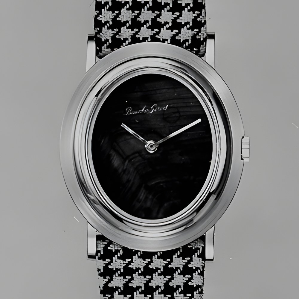This extra-slim lady’s watch is graced by a dial in semiprecious “falcon’s eye” stone. New techniques allow such stones to be cut to the thinness of a normal metal dial. This dial is of such thinness that, at certain angles, the plate underneath can be seen. Oval, 18-carat gold “Belle Epoque” case. (BUECHE-GIROD)