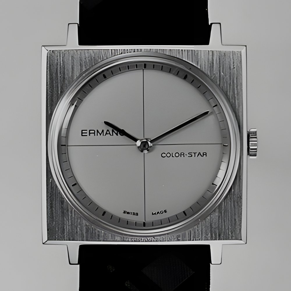In Basle, Ermano presented a complete series of models, with coloured dials and bracelets, aimed at the younger set This watch, with gold-plated case has a blue dial without numerals but with a minute-circle (the minute-circle zone is in darker blue than the rest of the dials). Blue plaid synthetic bracelet. Also available in numerous other colours. (ERMANO “Color-Star”)