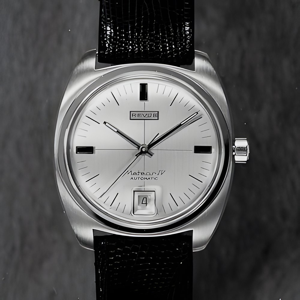 This man’s automatic watch incorporates the new MSR movement, one of the revelations of the last year ’s Fair. Calendar aperture at 6 o’clock, clearly legible minute circle, slight “tonneau” lines of the waterproof case. Available in goldplato or steel. (REVUE “Meteor IV”)