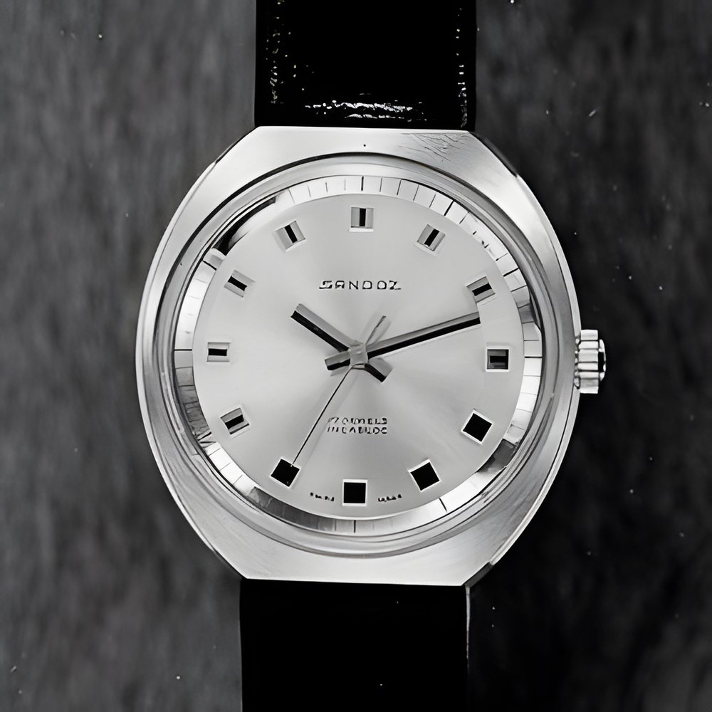 The "tonneau line now so fashionable is a result of the present trend to integrate the bracelet directly with the case. Another aspect of today’ s fashion : a stroke of colour on the hour markers, here onyx-like black. Waterproof goldplated case, steel back. (SANDOZ)