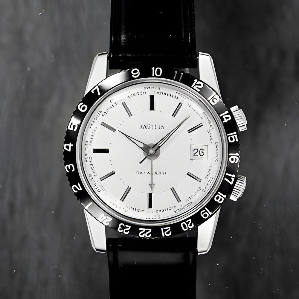 “Technical” watches are the rage today. This model, created with world travelling executives in mind, has an alarm, a calendar and a rotating bezel which serves to determine the time in every important city whose name appears on the dial. Waterproof case. (ANGELUS “Datalarm”)