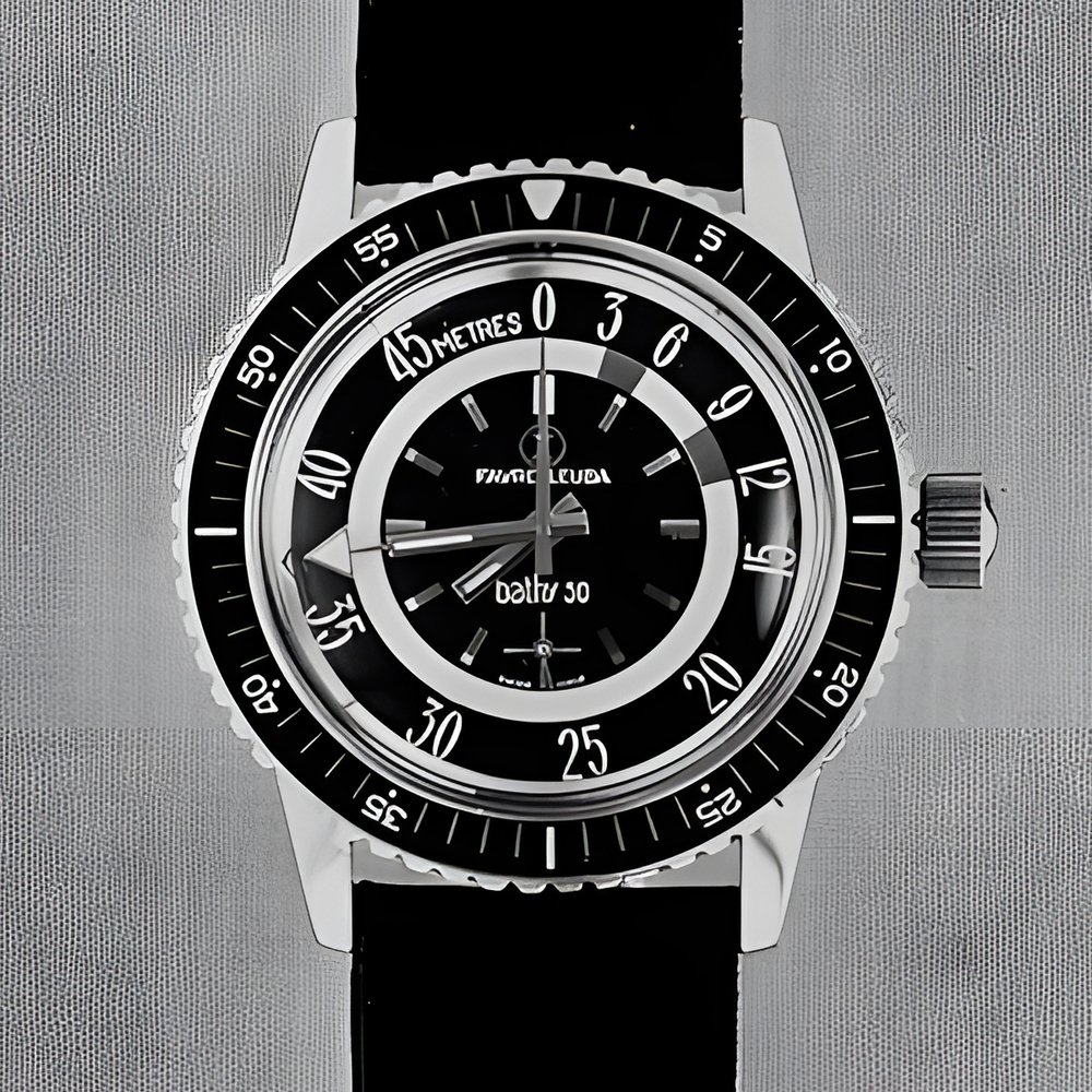 The Favre-Leuba diving watch with depth indicator unveiled last year displays new improvements this year. The centre hand now shows depths to 50 meters (165 feet) and both elapsed time and depth are clearly indicated on the modified dial. Turning bezel, all-steel case guaranteed waterproof to 150 meters (495 feet). (FAVRE-LEUBA “Bathy 50”)