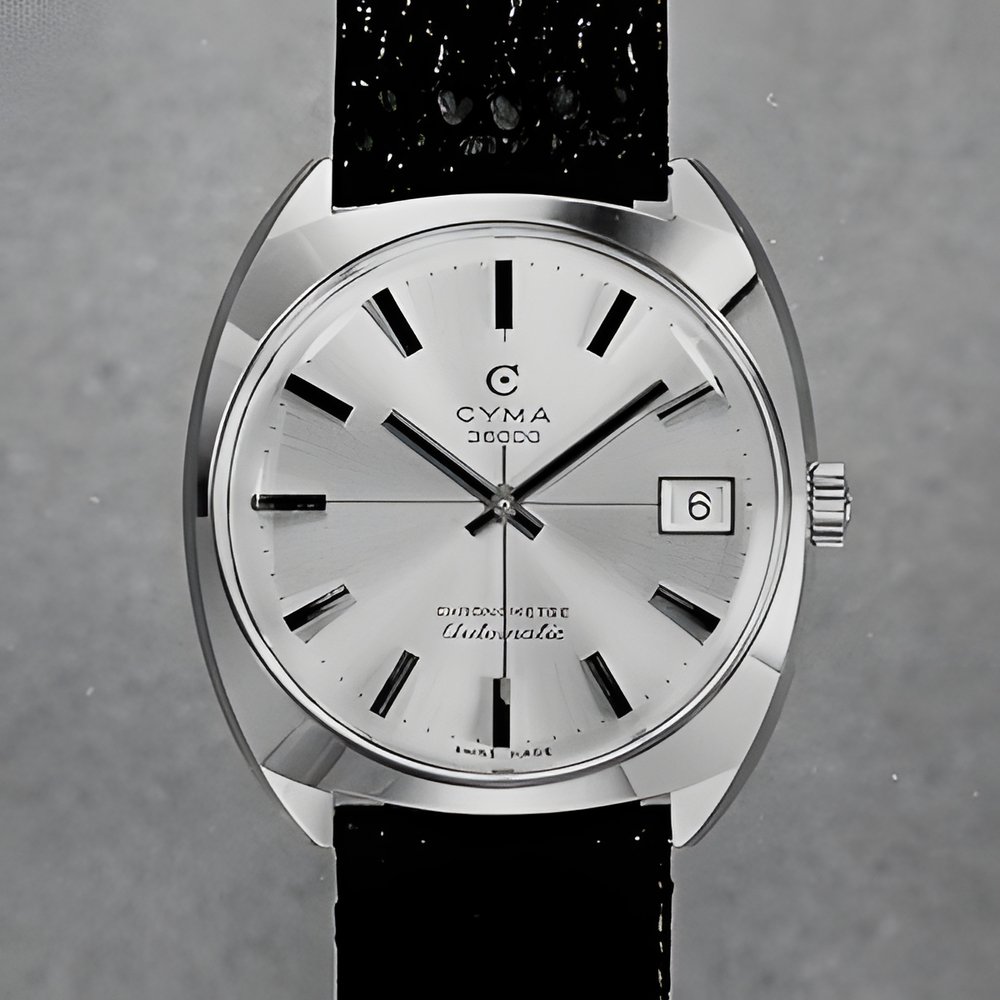 A new version of the Cyma 36,000 vibratior per hour chronometer, first introduced last year in Basic. The case, available in 18 ct gold, goldplate or steel, displays the new “tonneau” lines. The high-frequency movement is self-winding. This new system is reputed for its high rate stability. (CYMA “36000” Chronomètre)