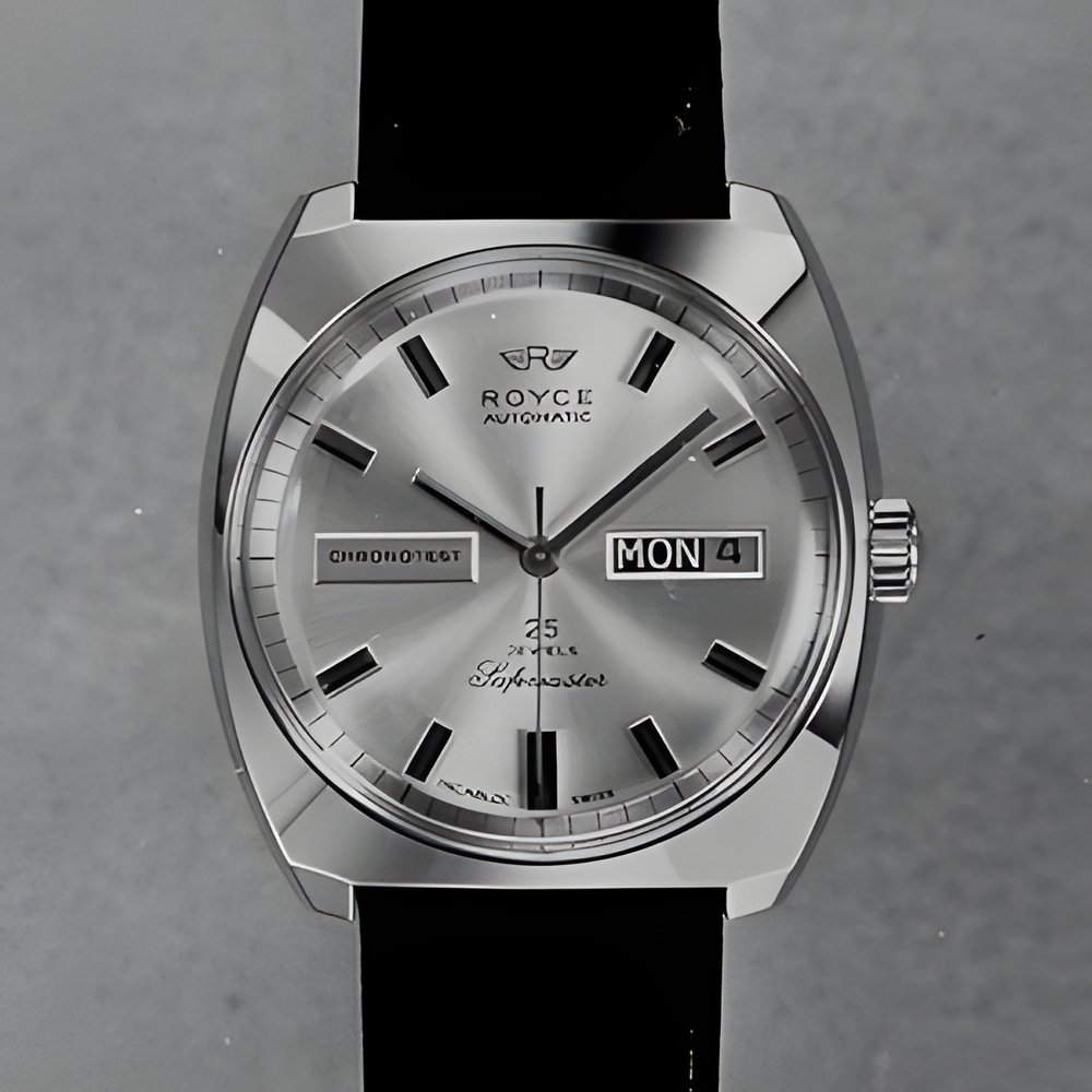 A sports watch with a “technical” flavour. Automatic, day and date calendar, case waterproof to 10 atmospheres. In addition to the usual shock-protection device, an elastic suspension system inside the case provides added protection. Silvered dial, raised hour studs, wide minute circle. The strap flows cleanly into the case. (ROYCE “SafcrnasterChroflotesL”)