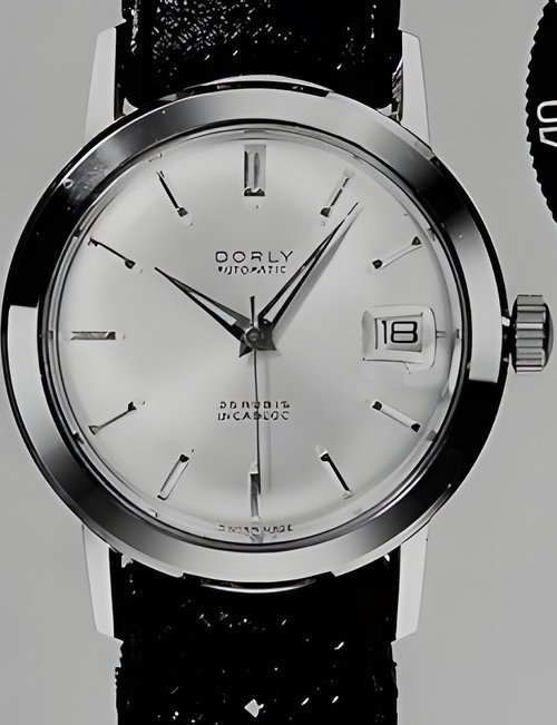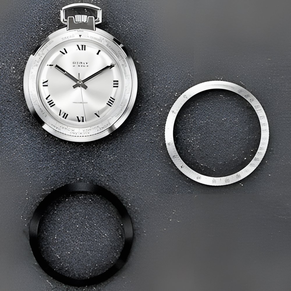 The first pocket watch with interchangeable rotating bezels. Universal time, tachymeter, memory aid or plain coloured bezels are easily removed and replaced with the help of a blade contained in the case which holds the set. Chromed case, centre secondshand. (DORLY “Acta”)