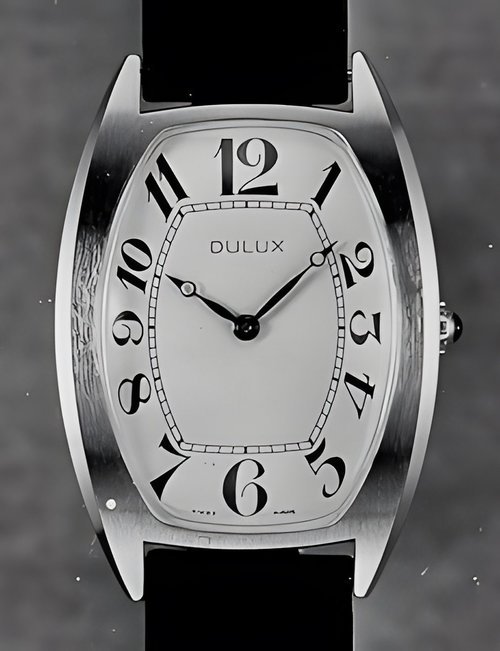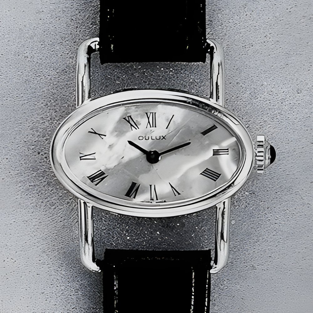 This model stands out by its “stirrup” loops, oval case and dial with mother-of-pearl finish. Roman or Breguet figures. In 0.800 silver or 18 ct yellow gold. A cabochon sapphire graces the crown. (DULUX)