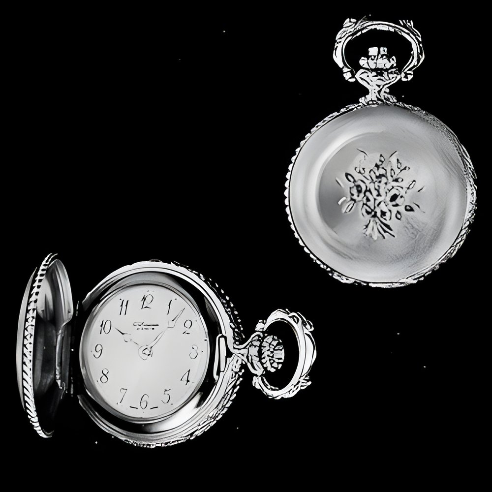 Small “savonette” watches with cover lid activated by a pushpiece. Worn as a pendant or carried in the handbag. Traditional styling, Breguet dial. Goldplate case with engraved floral motif. Also available in 18ct gold with enamel. (UHLMANN-Genève)