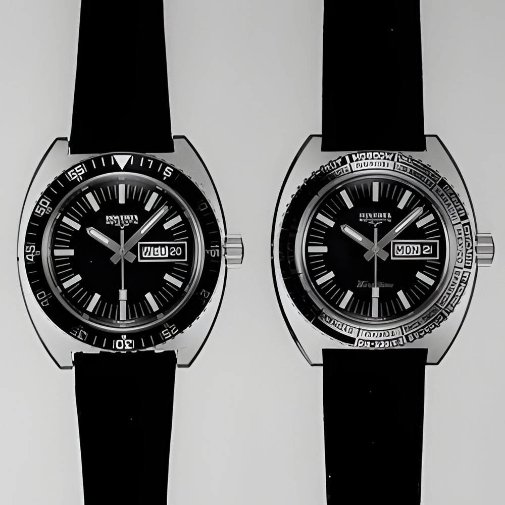Two related models. One is equipped as a diving watch with turning bezel for elapsed times underwater; the other shows universal time. Both are fitted with an automatic movement and a day-date calendar. All-steel case tested to a depth of 200 m. (HOVERTA)