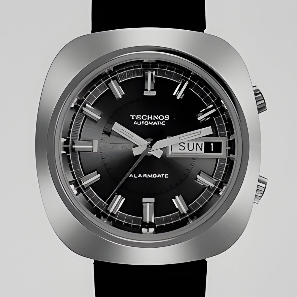 An alarm-watch whose buzz can be set with a precision of ± 2 minutes ! Automatic winding of both the high frequency movement (28,800 v.p.h.) and alarm mechanism. Day-date calendar with fast corrector. Waterresistant to 5 atmospheres. (TECHNOS “Alarmdate”)