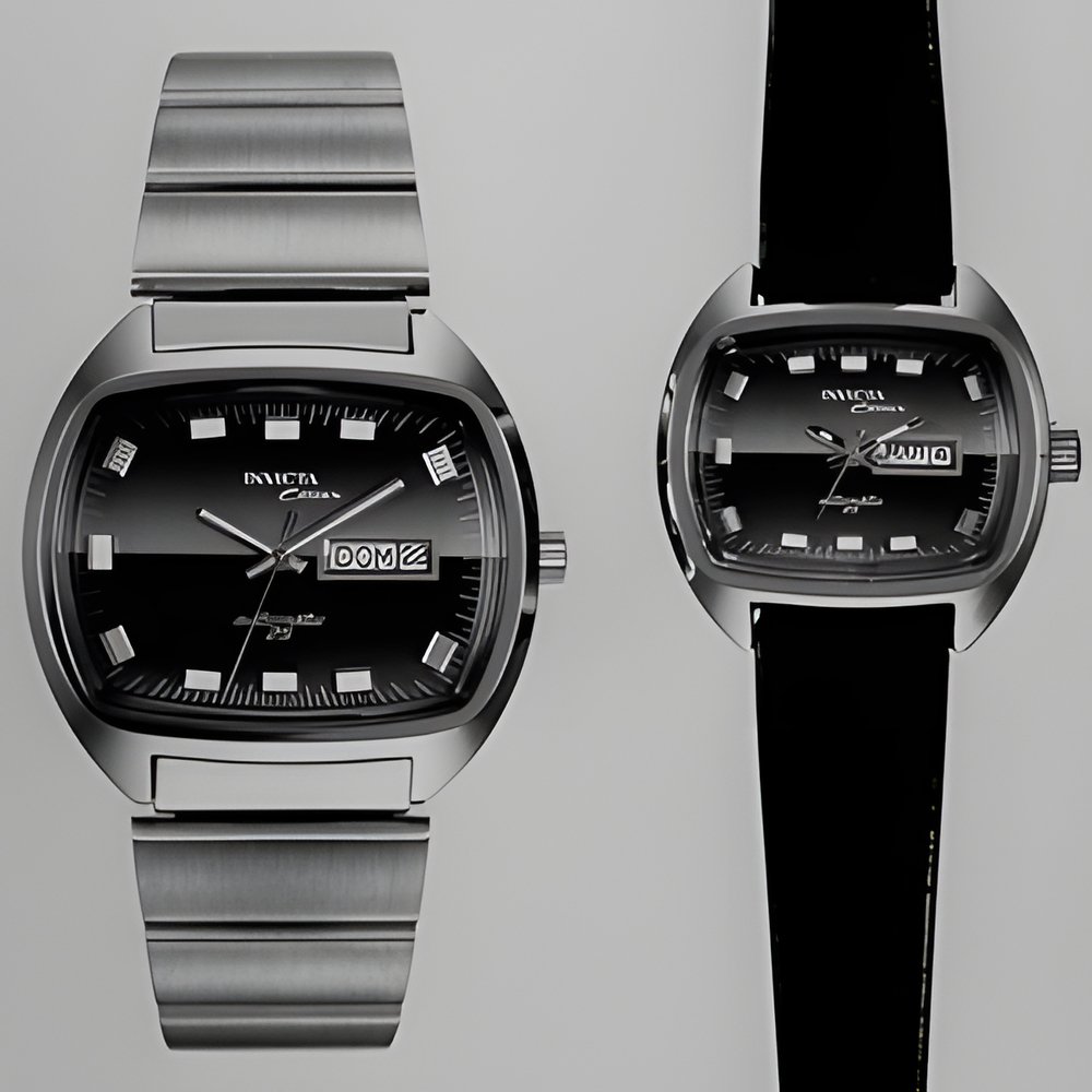 Two models identical in styling save for size. Automatic movement and day-date calendar, water-resistant steel case. The one technical difference is that while the man s model has a high-frequency (28,800 v.p.h.) movement, the lady’s has a 21,600 v.p.h. rate. (INVICTA “Crown”)