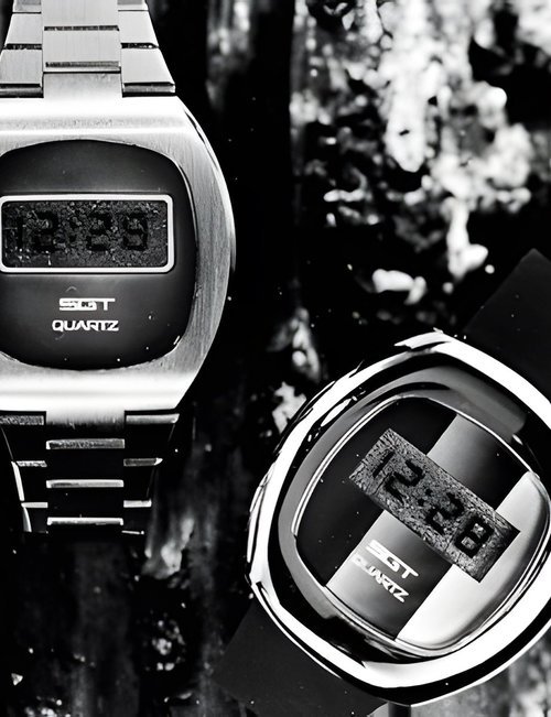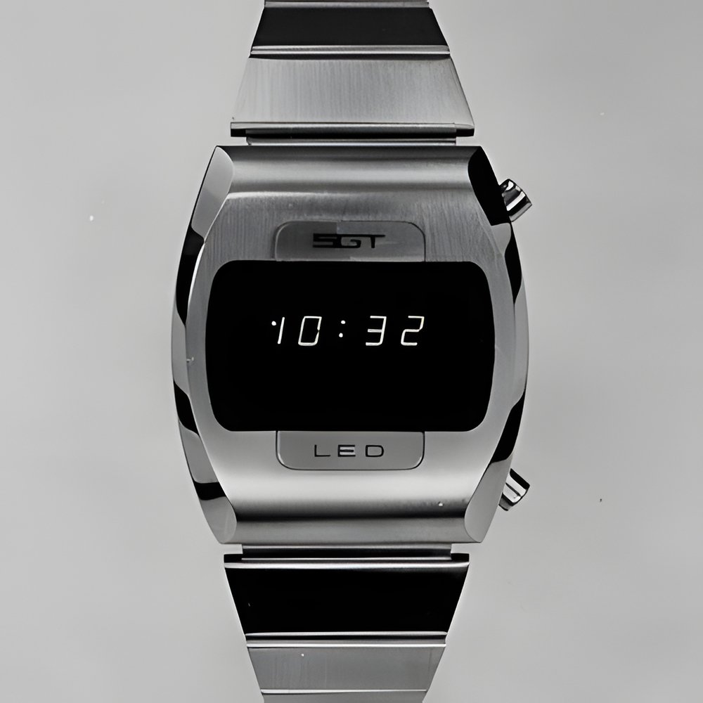 Modern styling for an advanced timepiece : SGT’s solid-state LED (light-emitting diodes) watch. A push on the top button commands the hour and minute (with a dot to distinguish a.m from p.m. time). A push on the bottom button commands the seconds and date readout. When 95 % of the batteries’ power is spent, the display starts blinking to indicate that battery change is necessary. (SGT - Société des Garde-Temps - LED)