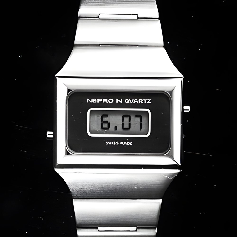 The world’s first extra-flat solid-state electronic wristwatch Module thickness is 4.5 mm, flatter than a standard calendar automatic movement. Swiss-made module and display. Permanent readout of the hour and minute, seconds plus calendar on command. Readout lighting for nighttime. (NEPRO)