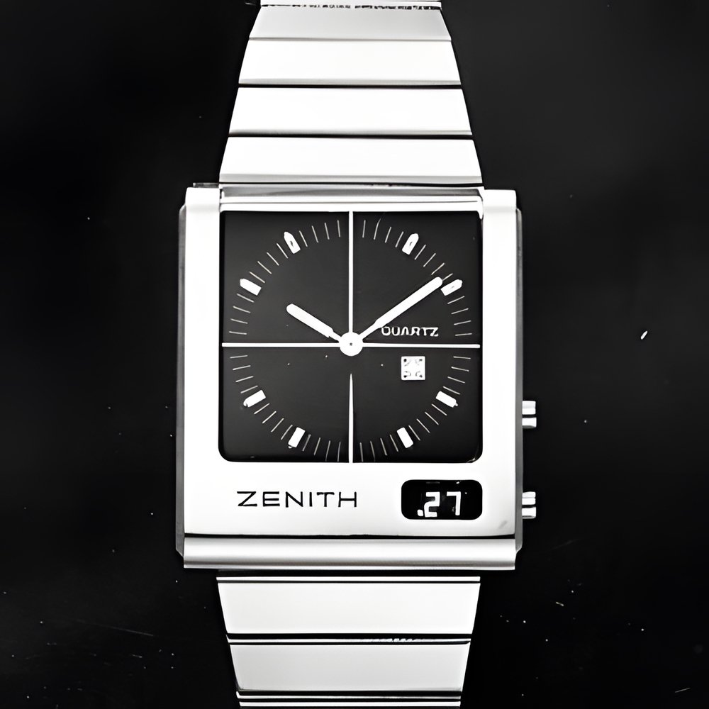 This new Zenith watch combines two time display systems : the digital and the analog (i.e. with hands). The analog system provides a permanent hours-and-minutes display while the light-emitting diodes flash the date and the seconds on command. 1-minute-a-year quartz accuracy. A new concept that is sure to make a lot of converts to electronic timekeeping. (ZENITH - Quartz)