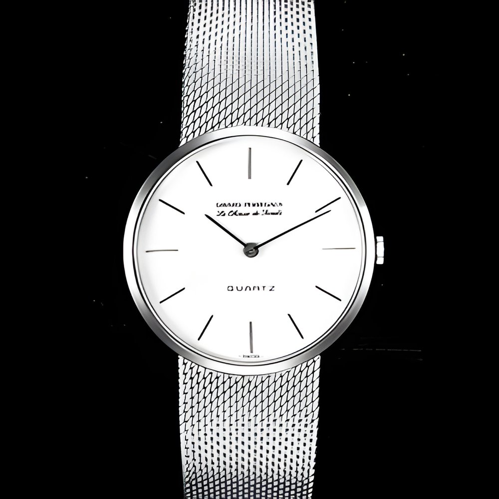 The elegance of quartz electronic timekeeping is shown by this man’s watch fitted with the new Girard-Perregaux movement that is only 3.45 mm thick including battery. Its 20.50 mm diameter also makes it ideal for dainty ladies models. Available with centre (sweep) seconds hand. This particular model is in stainless steel with welded band. (GIRARD-PERREGAUX - Quartz)