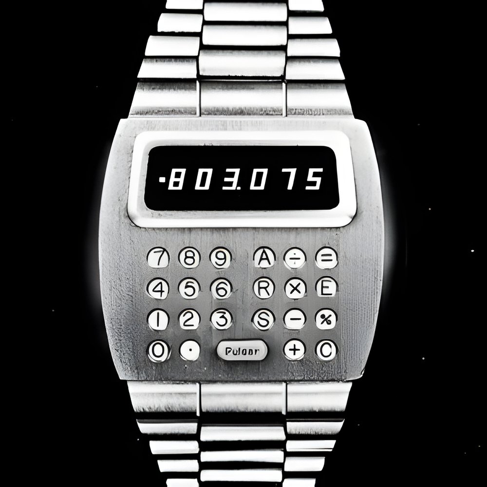 Pulsar solid-state watch with LED display and calculator that adds, subtracts, multiplies and divides; results can be stored in a memory. (PULSAR)