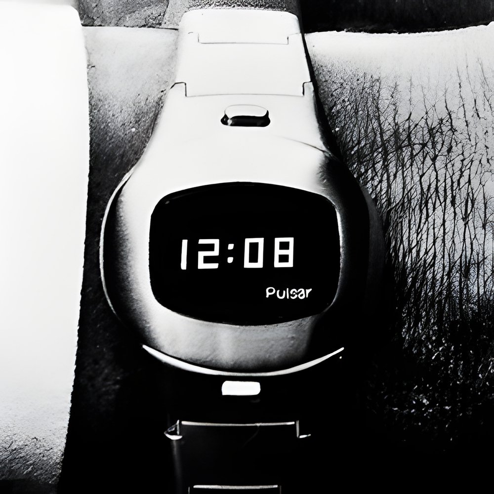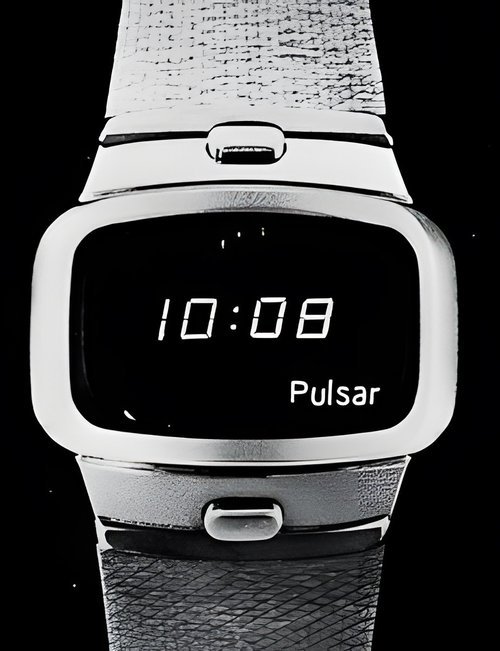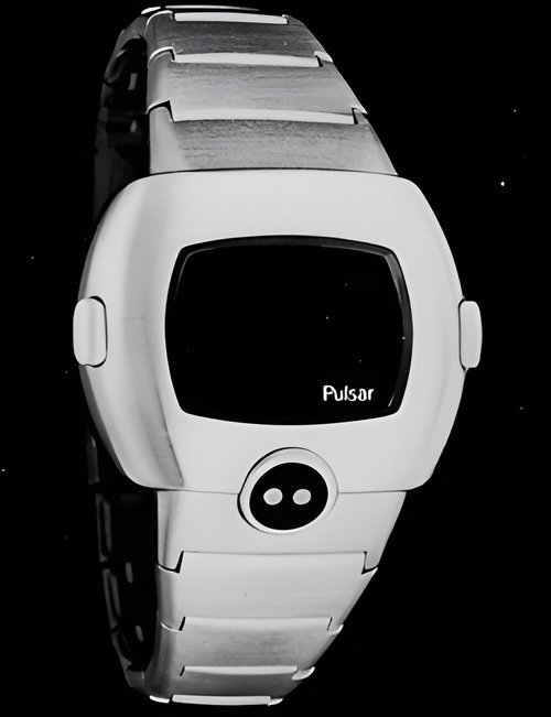 Pulsar solid-state watch with light-emitting diode (LED) display. An inertia switch causes the display to light up with a flick of the wrist. No need to press a button any more. (PULSAR)