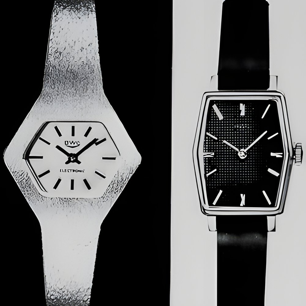 Two gracefully feminine models with drive-balance electronic movement. Water-resistant chrome, goldplate or all-steel case. These practical timepieces run whether they’re worn or not and their accuracy does away with the bother of resetting them constantly to the right time. (BUTTES WATCH CO. - BWC)