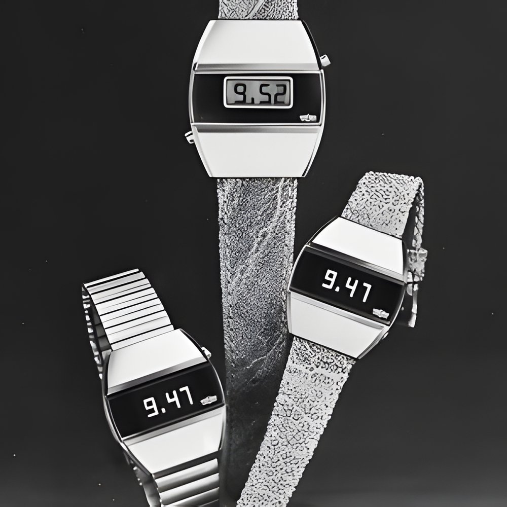 These new solid-state watches from Vulcain are notable for their extreme accuracy. Their elegant contemporary styling is specially tailored to this new type of timepiece. Quartz frequency is 32,768 Hz. LCD readout (top) : permanent hours and minutes, with date and month on command. Screen backlight for night reading. Plus LED readout (bottom), also featuring the day of the week. Calendars are programmed for 4 years. (VULCAIN)