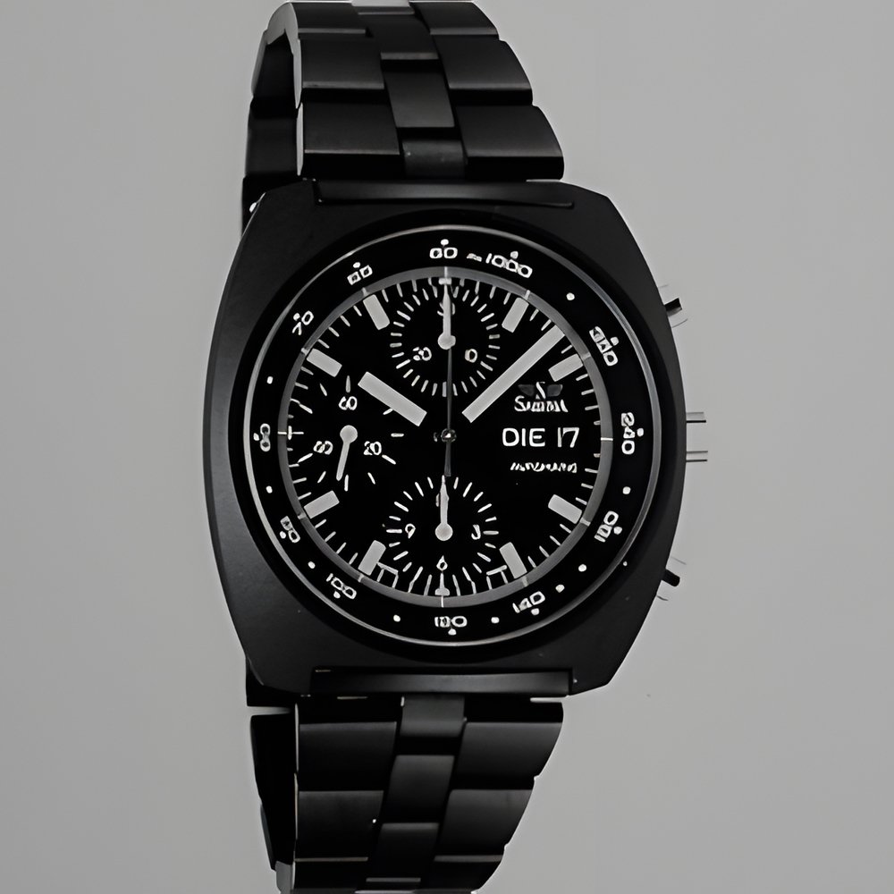 A very functional-looking chronograph with steel case and bracelet blackened by a special finishing process. Black dial. Selfwinding movement, day-date calendar, hour and minute counters. The case is water-resistant to 50 m (5 atm) ; a tachymetric scale is inscribed on the mineral glass. (SABINA)