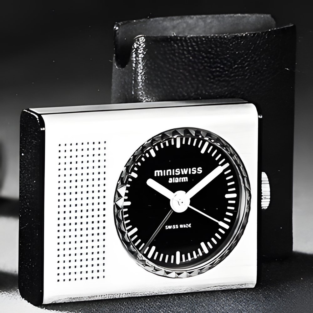 A new miniature alarm clock in the “Miniswiss” series by Nepro ; electronic buzz, handwound mechanical movement. (NEPRO “Miniswiss”)