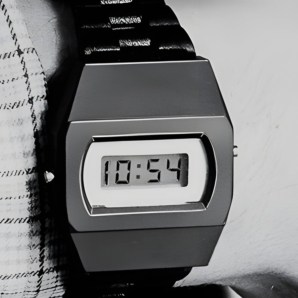 This solid-state electronic model with liquid crystal digital display contains a module of entirely new design. Six functions plus screen lighting, a choice of 4 different readout possibilities including one that automatically alternates the hour/minute and the month/date readouts. Very simple adjustment system allowing independent correction of the various functions. 4-year preprogrammed calendar. The module is un-usually thin (for elegant styling) and the uniform lighting on the screen requires very little power. 32,768 Hz quartz oscillator. The batteries last 2 years or more. (SINDACO)