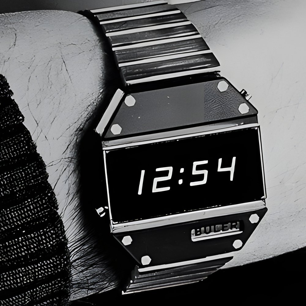 A model from the complete collection of LED (light-emitting diode) quartz electronic watches presented by Buler at the 1976 Basle Fair. Designed for both men and women, these timepieces display styling that is particularly well tailored to this new wristwatch concept. (BULER)