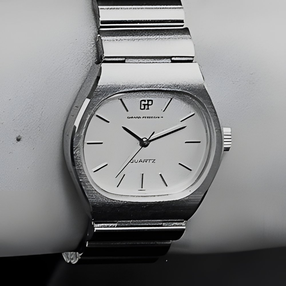 This all-steel water-resistant case with very thin and undeniably feminine and elegant lines houses a high-precision quartz electronic movement. Integrated steel bracelet. Accurate to within one minute a year, this watch runs without winding or without even having to be worn. (GIRARD-PERREGAUX “Quartz 641”)