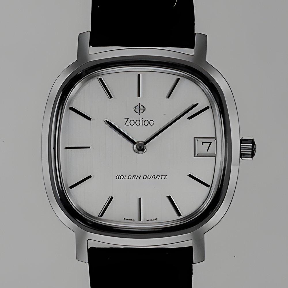 Analog display (dial and hands) quartz electronic watch featuring a new extra-thin movement that is only 3.7 mm thick, including the battery. Instant-change date calendar, corrector and stop-second system. Waterresistant case. (ZODIAC)