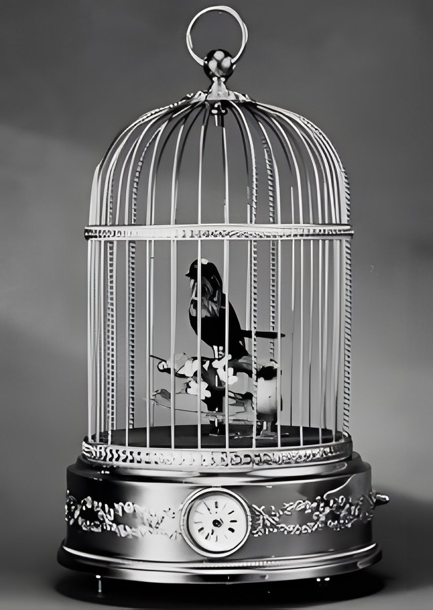 This gilded case contains two singing birds with multicoloured feathers. At the time selected on the alarm clock, they pivot, turn their head, move their beak and tail feathers, just like live birds. And best of all - they warble. Both watch and mechanism run on a long-lasting battery. Also available as a doorbell or signal. (REUGE, Sainte-Croix)