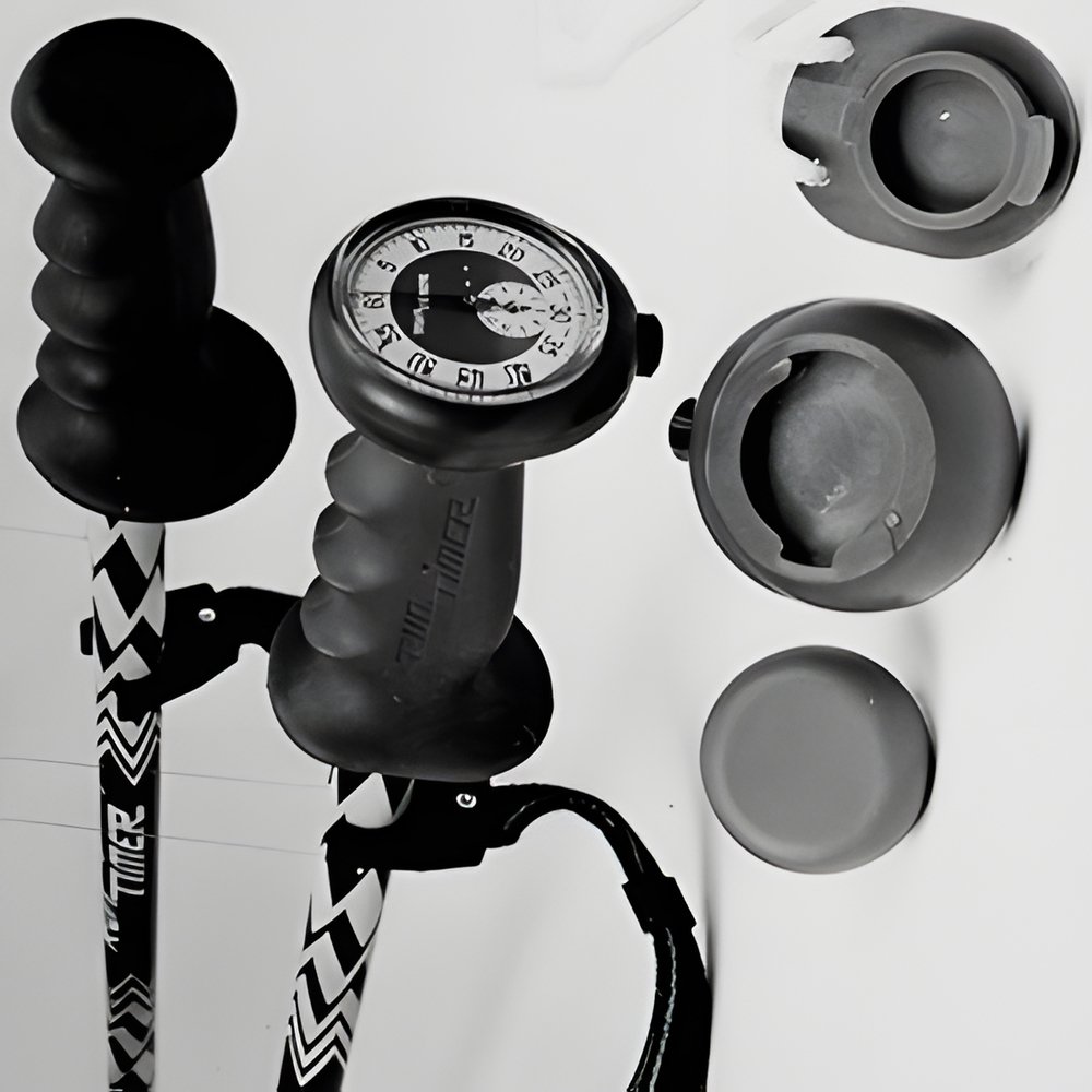 A skipole with built-on timer : just the thing for training and racing. The timer itself is detachable (turning the pole back into a “normal” one) and can be worn around the neck on a special brace fitted with a cord or else affixed to a car dashboard. (BAUMGARTNER FRERES - BFG - “Run Timer”)