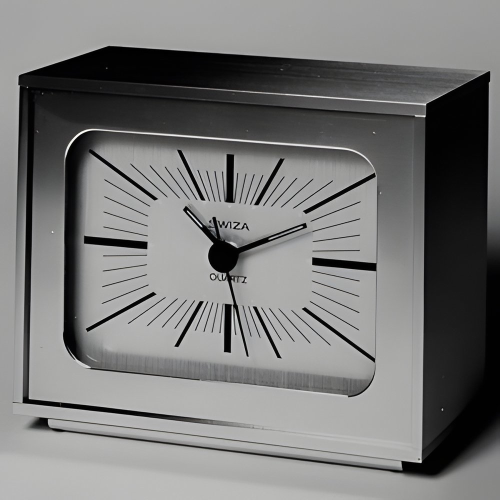 Higher frequency for greater accuracy. The quartz oscillator of this alarm clock, with chimes, vibrates at 4019 Megahertz (that’s right : over 4 million vibrations per second). Solid brass case, brush-finished silvered dial. Also available with nickelled finish. (SWIZA -Quartz)