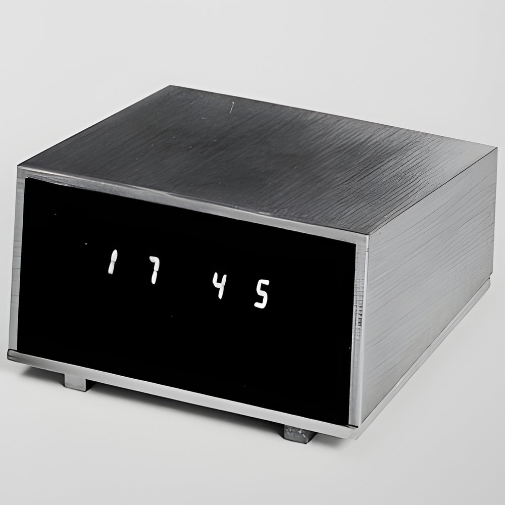 Small solid-state electronic table clock fitted with an LED, LCD or gas-discharge display, showing the hours2 minutes and date. Available with or without alarm mechanism. Mains (house current) powered. (PONTIFA)