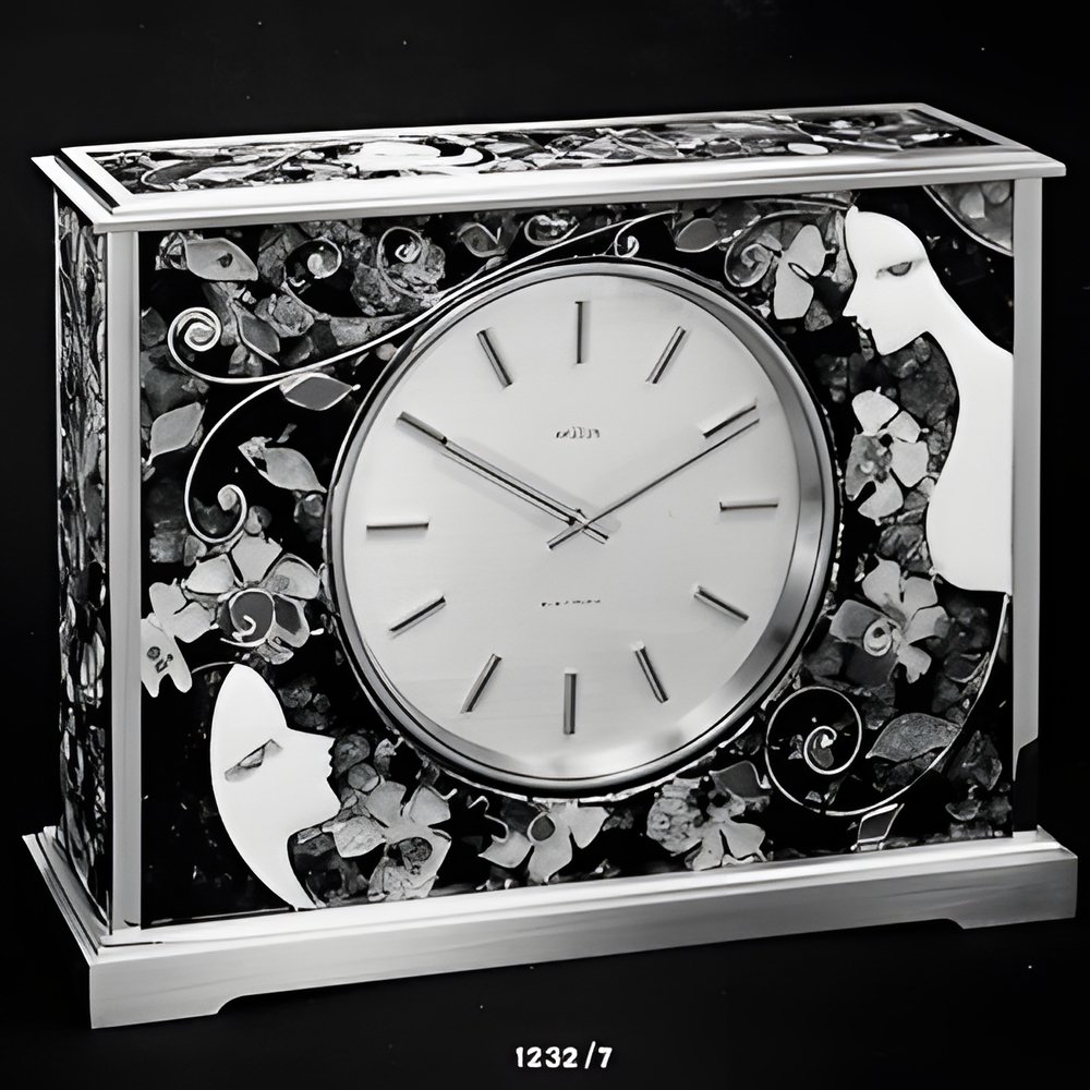 A table clock with a quartz electronic movement. The gilt brass case features copper plates enhanced with silver-cloisonné enamel work by one of today’s foremost Japanese artists : YoshikoHasegawa. (ANGELUS)