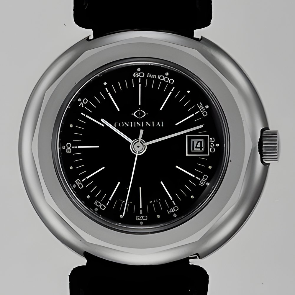 A real “holiday watch” - it’s amusing, it’s functional, it’s just the thing for all your leisure time activities And it’s so economically priced that if it got lost or stolen, your budget wouldn’t feel the strain. Large rounded gloss-polished chromium-plated case, broad black dial and “notched” bezel, With tachymeter. (CONTINENTAL)