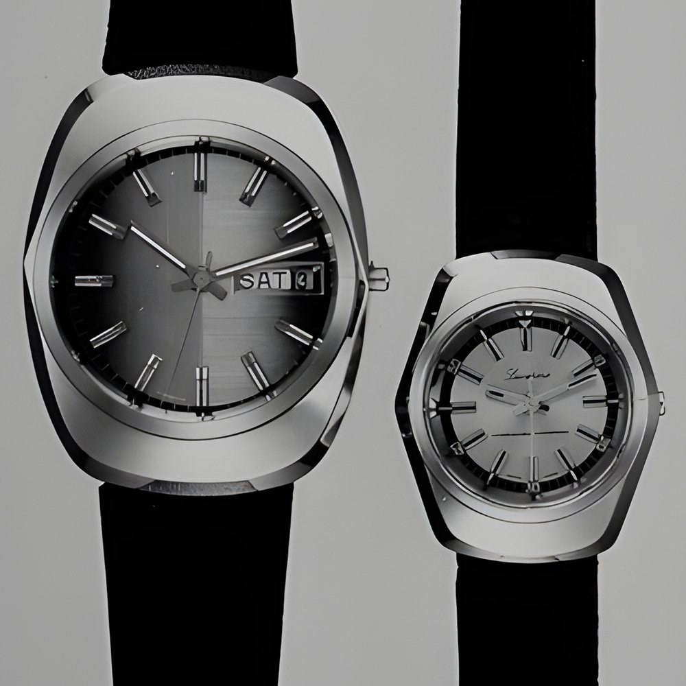 “His and Hers” watches enjoy unahating popularity. These two economically priced models are both shock-protected and water-resistant. Chrome or bronzinal (bronze coloured) case. (FEREX)