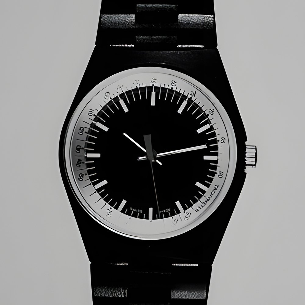 Very much in the swing of things: the large-size watch for men, with black synthetic one-piece case and bracelet. The black dial and tachymetric scale add to its functional looks. Most attractively priced, too. (RENDEX)
