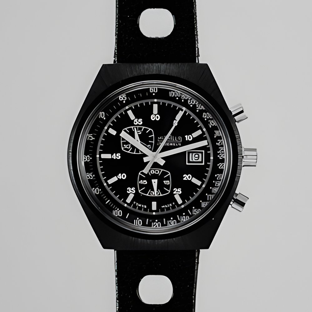 Designed for young sportsmen: a chronograph with seconds and minute recorders, a calendar and shock protection. Its fashionably black case is of course water-resistant. An attractively economical model.