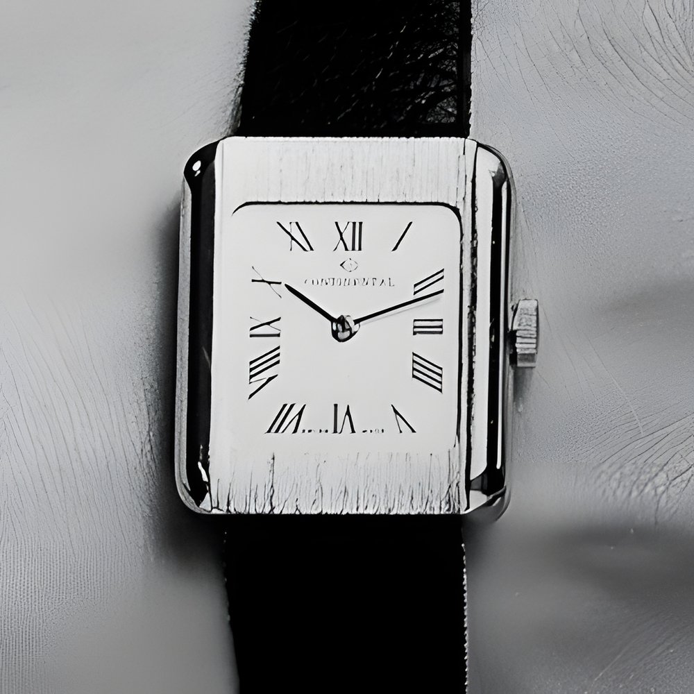 Roman numerals are back again, to grace this model’ s broad and elegant dial surface. It t s an economical model (and very affordable indeed) whose good looks come from the contrast between polished, rounded lines and brush-finished areas. Very thin case. Available in chromeplate or goldplate (CONTINENTAL)