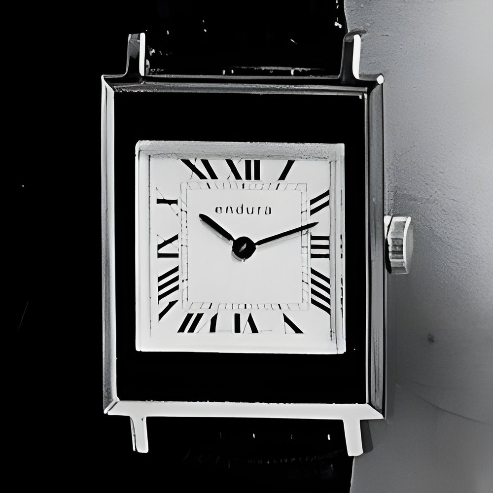 A model with modern styling apparent in the chromed case and black, lacquer-like bezel, and a nostalgic touch in the enamel-like dial featuring Roman numerals and a bold minute track. An economical model (ENDURA)
