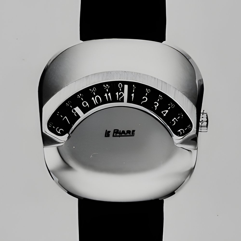 The dial of this “Sectora”-display watch shows 8:02e The hands sweep the dial from left to right and then automatically snap back to their starting point. This system offers designers a wide range of new styling possibilities. (LE PHARE “Sectora”)