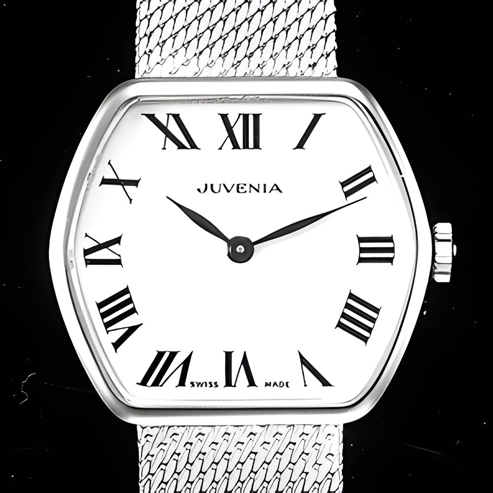 A graceful ladies model epitomising all the latest styling trends : broad dial with Roman numerals, slim polished and rounded bezel, very thin hexagonal case combining straight and rounded lines. Stainless steel, with mesh bracelet welded to the case. (JUVENIA)