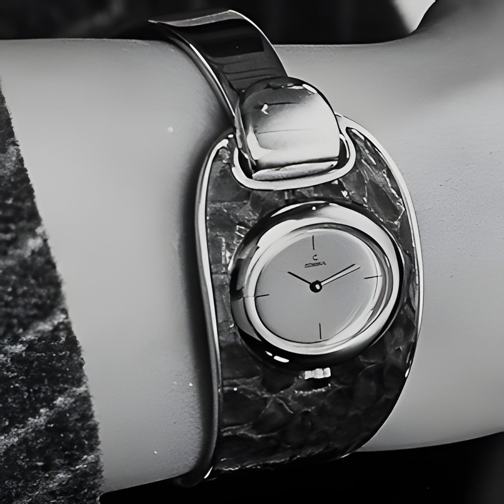 Rigid “Manchette” bracelet for this goldplated model. The bracelet is partly sheathed with genuine snakeskin. (CONSUL)