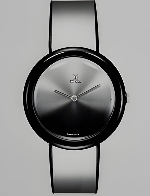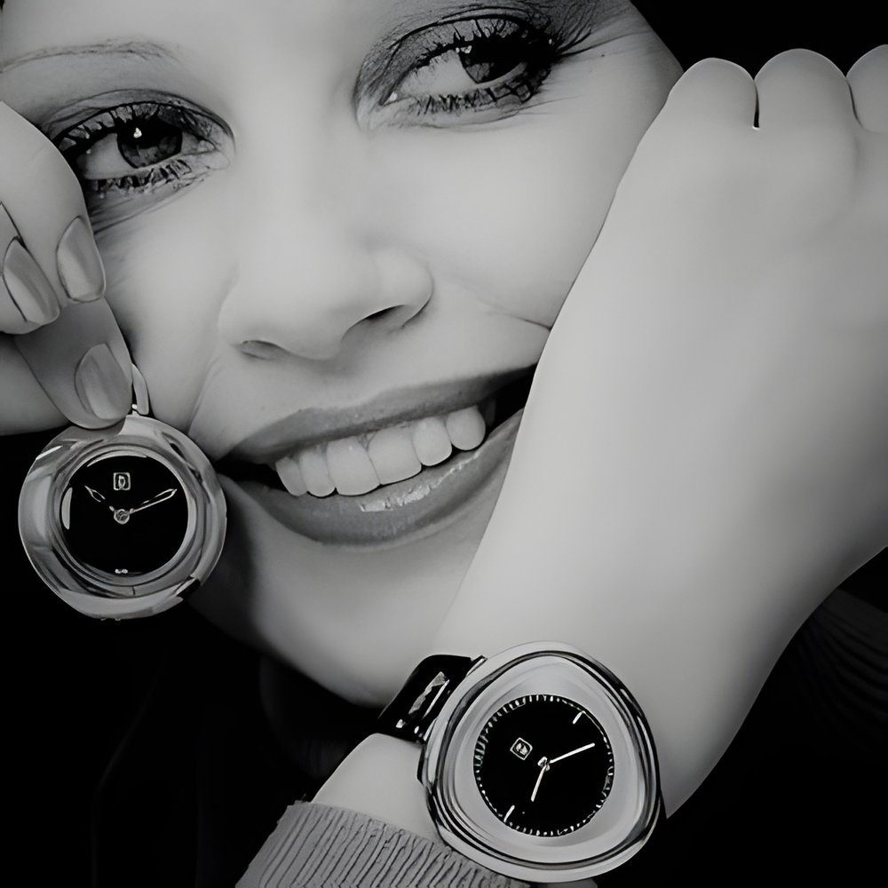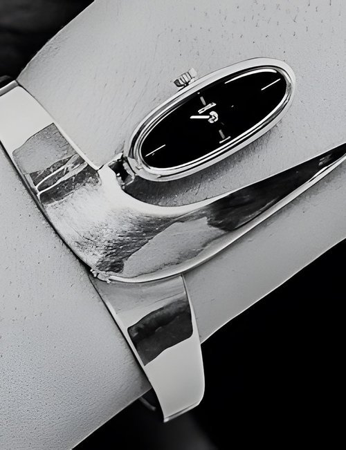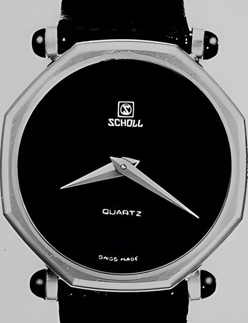 Gently rounded modern lines : silver cases with curving corners, polished surface finish and black dials. (SCHOLL-UHREN)